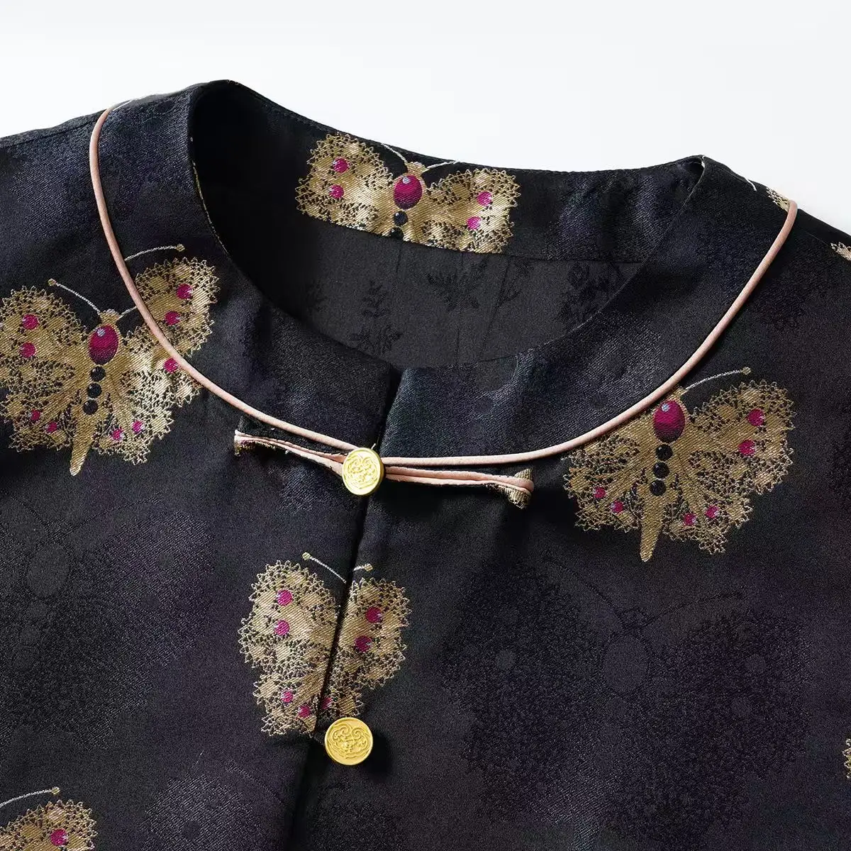 This vest adopts the traditional ‘ three twills ‘ heavy weft organization of Suzhou Song brocade, with dark black as the ground and real gold line as the weft, weaving the pattern of butterfly dance.
