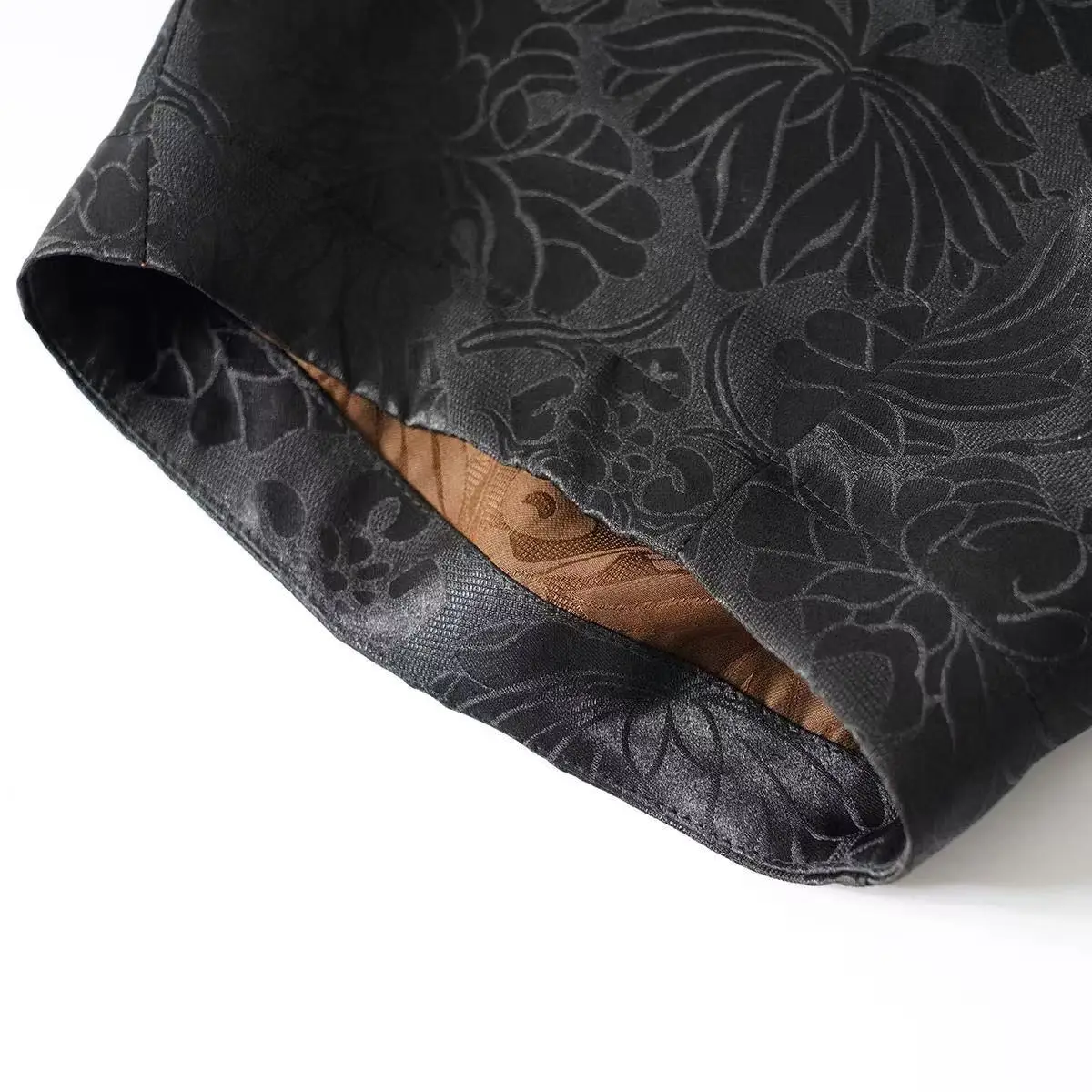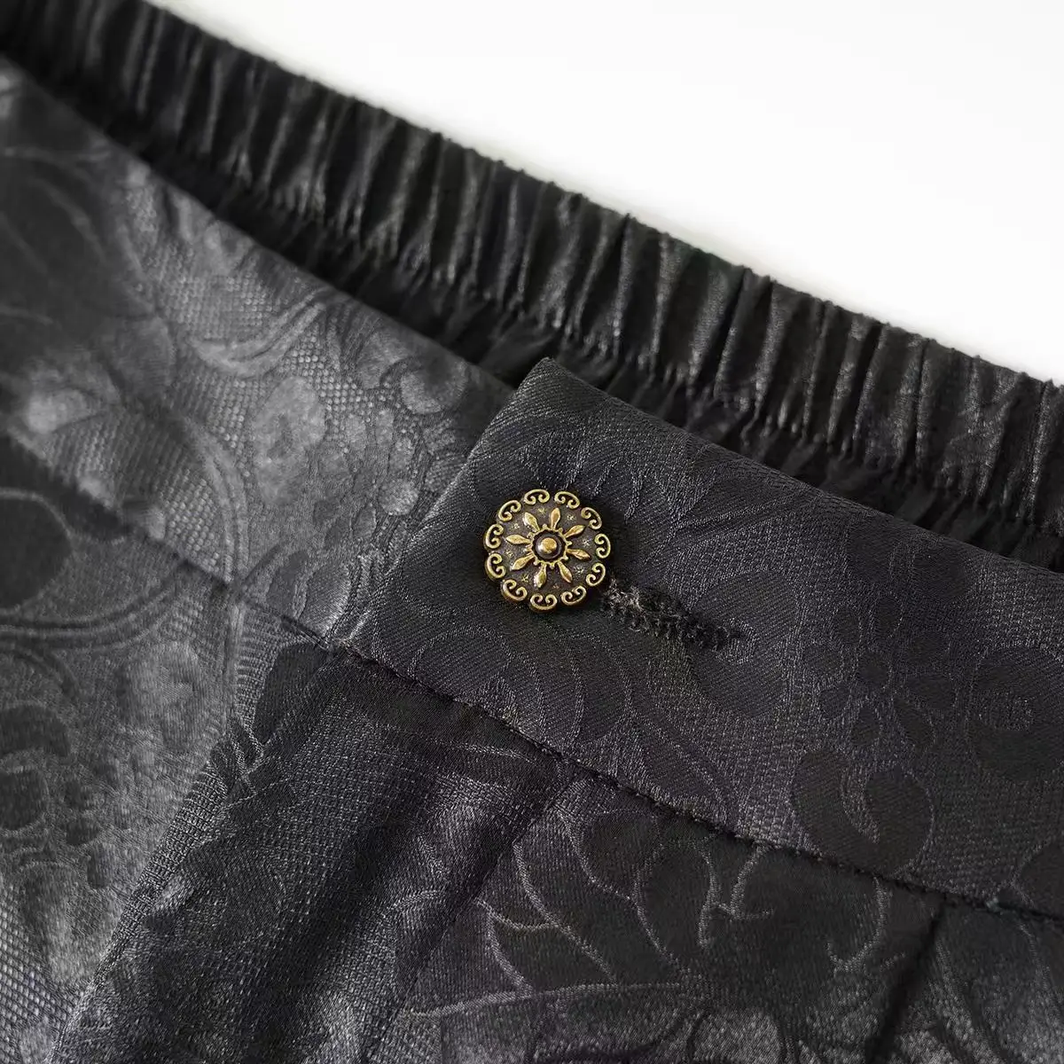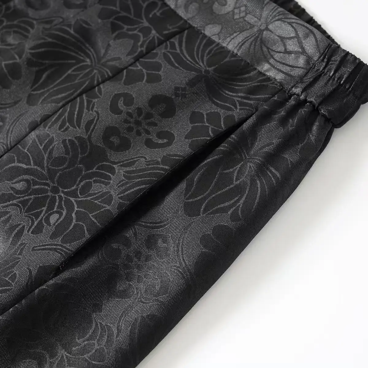 The invisible slits are designed at the foot of the pants, and the inner lining is decorated with dark lotus patterns, which are hidden when walking.