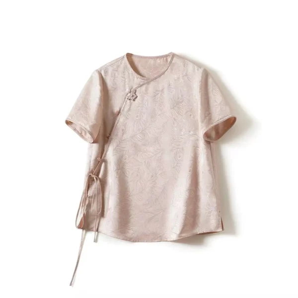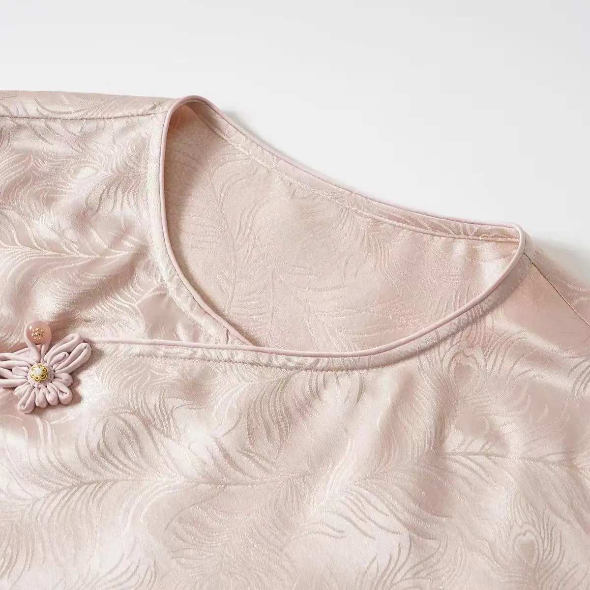 This short blouse uses 22 Momme of heavy mulberry silk fabric, weaving 3-dimensional geometric patterns through the jacquard process.