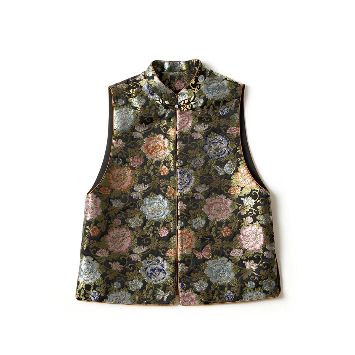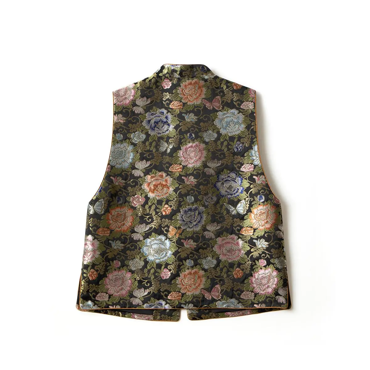 The waistcoat adopts asymmetric design, the left flap is full of winding peony, and the right flap is dotted with broken flowers.